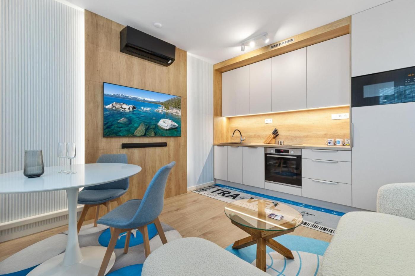 The apartment is composed of 1 bedroom, a fully equipped kitchen, and 1 bathroom. A flat-screen TV is featured.